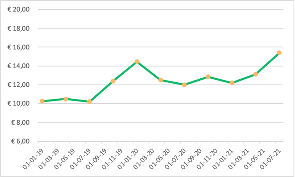 Op dit moment (21-12-2022) is de prijs €14,50. Let wel op dat dit geen vaste prijs is en iedere week opnieuw wordt bepaald.