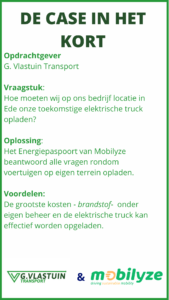 Een van de grootste uitdagingen én tevens voordelen van een elektrische truck is het opladen op eigen terrein. Je haalt een van de grootste kostenposten onder eigen beheer, maar moet goed weten of de bedrijfslocatie hier geschikt voor is. Dit was precies waar G. Vlastuin Transport tegen aan liep met haar locatie in Ede.